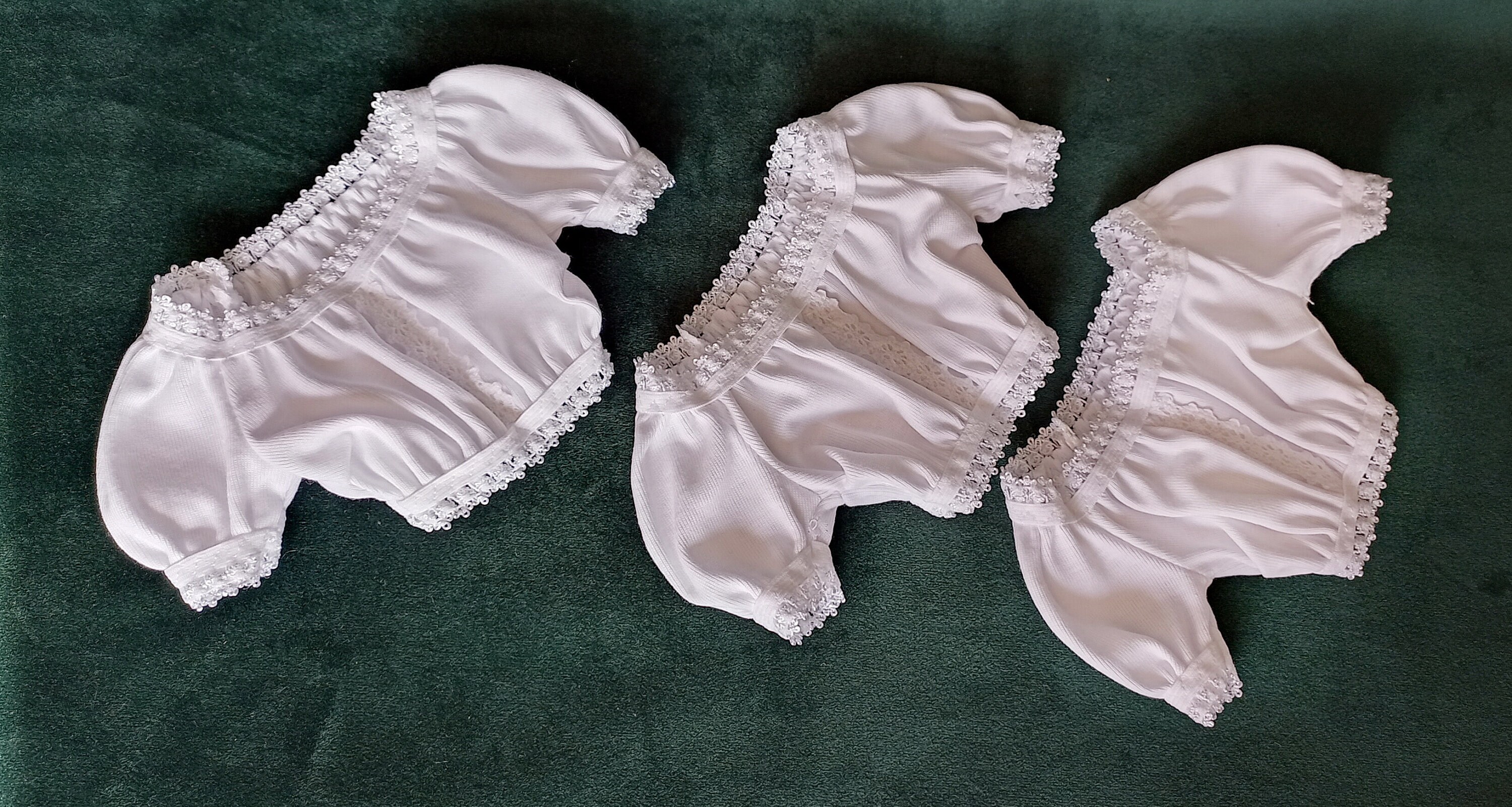 I design dolls clothes to make it easy to dress any doll. It is not necessary to remove the doll's head and arms. You can put on any dress or blouse, starting from the bottom, through the legs.