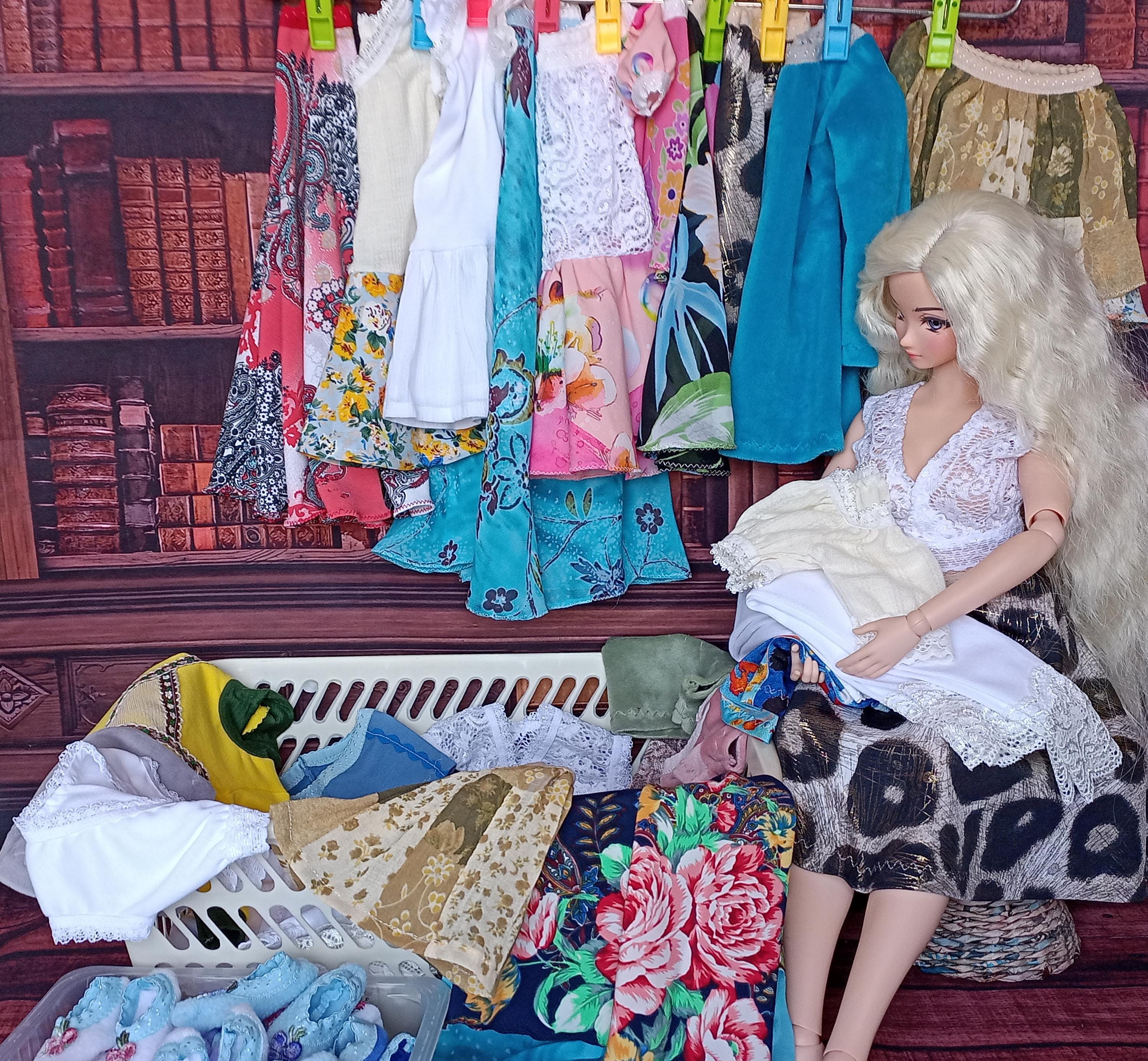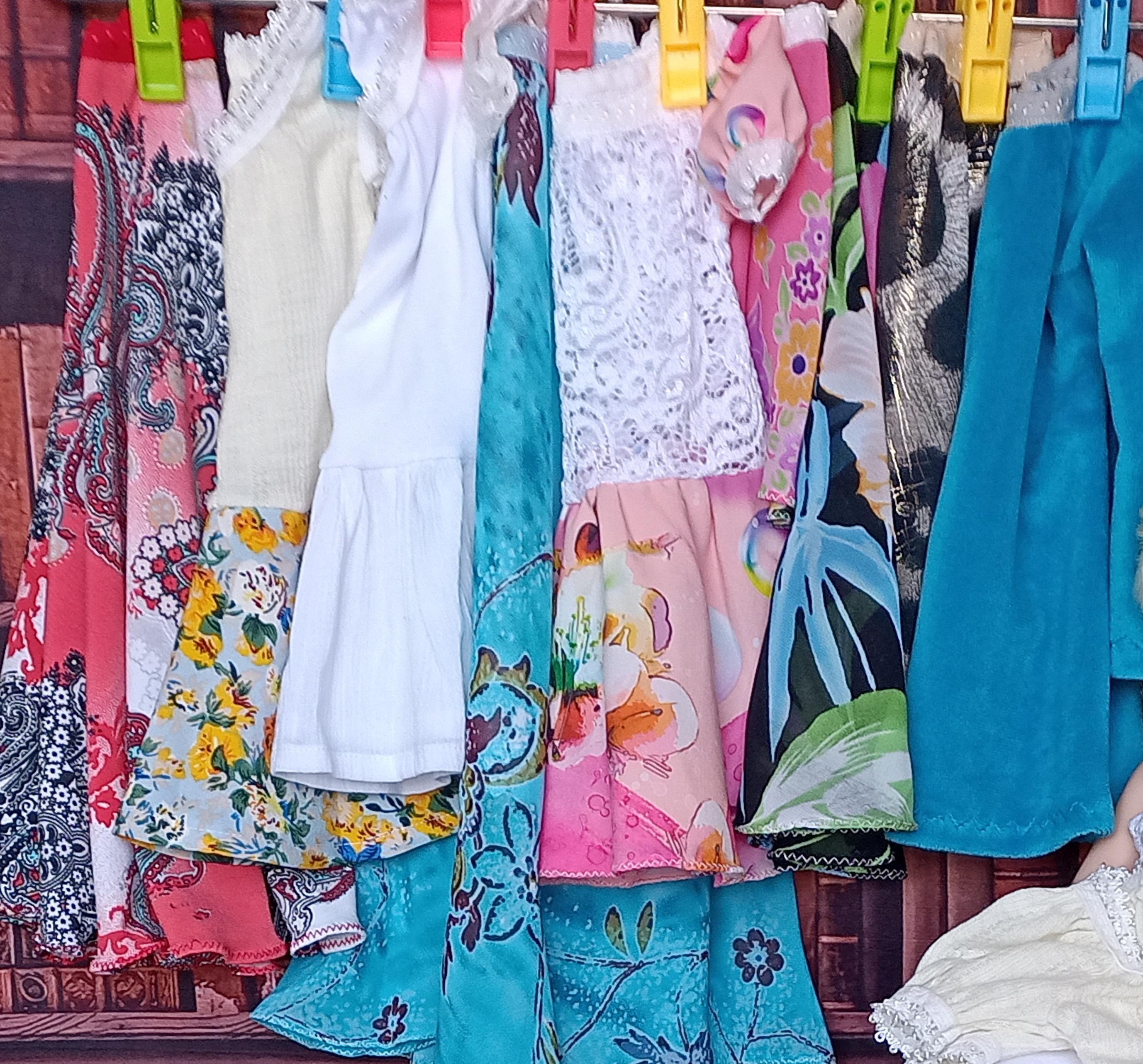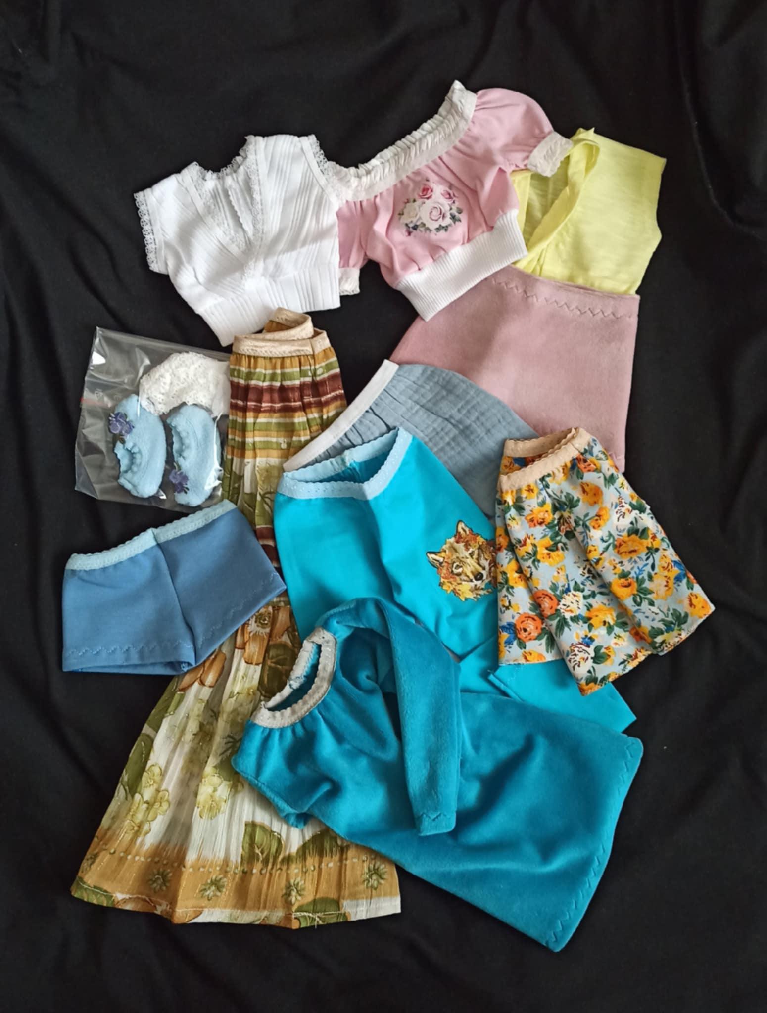 Opening this up was such a delight. I think this is the best Smartdoll clothing blind bag I've ever gotten. There was so much inside, each individually wrapped and can make so many outfits with them. My grab bag had: a sweatshirt, leggings, short shorts, harem pants, pencil skirt, a flowy skirt, a long flowy skirt, peasant top, lace top, wrap top, a butterfly necklace, and a pair of slippers. There was so much and it was all so well made while still being clearly hand made that it gave me crazy nostalgia for my grandma and the clothing she made for my dolls as a kid. I love this so much.